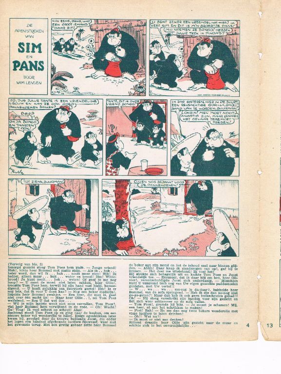 Dit nummer 4 heeft waarschijnlijk deel uitgemaakt van een bundeling en is later daarvan bevrijd. Ik zie nog sporen van de vroegere nietjes. Zoals gebruikelijk wordt bij het inbinden het boek schoon gesneden. Een gevolg is wel, dat het tijdschrift iets kleiner wordt. Er is echter niets van de tekst of plaatjes verloren gegaan. Op de voorkaft is Tom Poes, de jas van Heer Bommel en wat stenen met een paars potlood gekleurd. De kaften zitten nog maar met 5 cm aan elkaar vast. De overige pagina's hebben een scheurtje van 5 cm onderaan. Wat rafeltjes onderaan bij de pagina's 7 – 10. Mogelijk nog een enkel klein scheurtje. In het stripje Simpelman zijn met rood potlood 4 kruisen geplaatst. Gewicht 28 gram. Verzendkosten vanaf € 3,95 (met track & trace). Prijs € 7,50. Combineren is handig!
