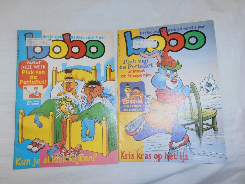 Een klein partijtje bladen van Bobo gevonden van 20 jaar en ouder. De meeste bladen zijn in nieuwstaat doch een paar hebben transportschade of gebruikssporen. De meeste bladen van 1996 en 1997 hebben een aflevering van Pluk van de Petteflet van Annie M.G. Schmidt met tekeningen van Fiep Westendorp. Daarnaast staan er verhalen en tekeningen in van Sesamstraat, Bobo, Binkie, de familie Beer en vele anderen. Aanwezig zijn de volgende nummers: