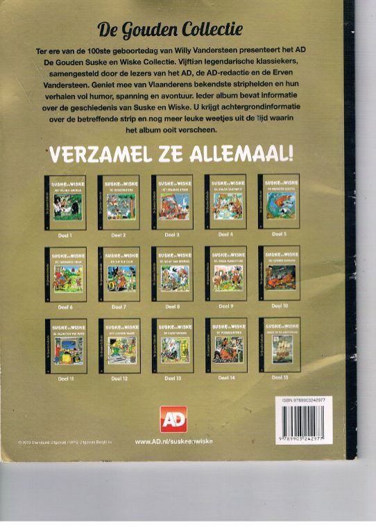 Speciale uitgave via het Algemeen dagblad in De Gouden Collectie in 2013. Vier kleuren. Voorin een beknopt overzicht van de eerste strips van Willy Vandersteen. Dit boekje heeft tijdens transport hier en daar wat in de knel gezeten. Rechts onderaan steekt er wat omhoog en de achterzijde vertoont enkele deuken. Daarom mag hij weg voor € 1,95. Gewicht 142 gram. Verzendkosten vanaf € 3,95.