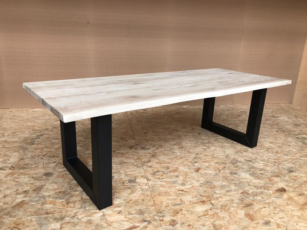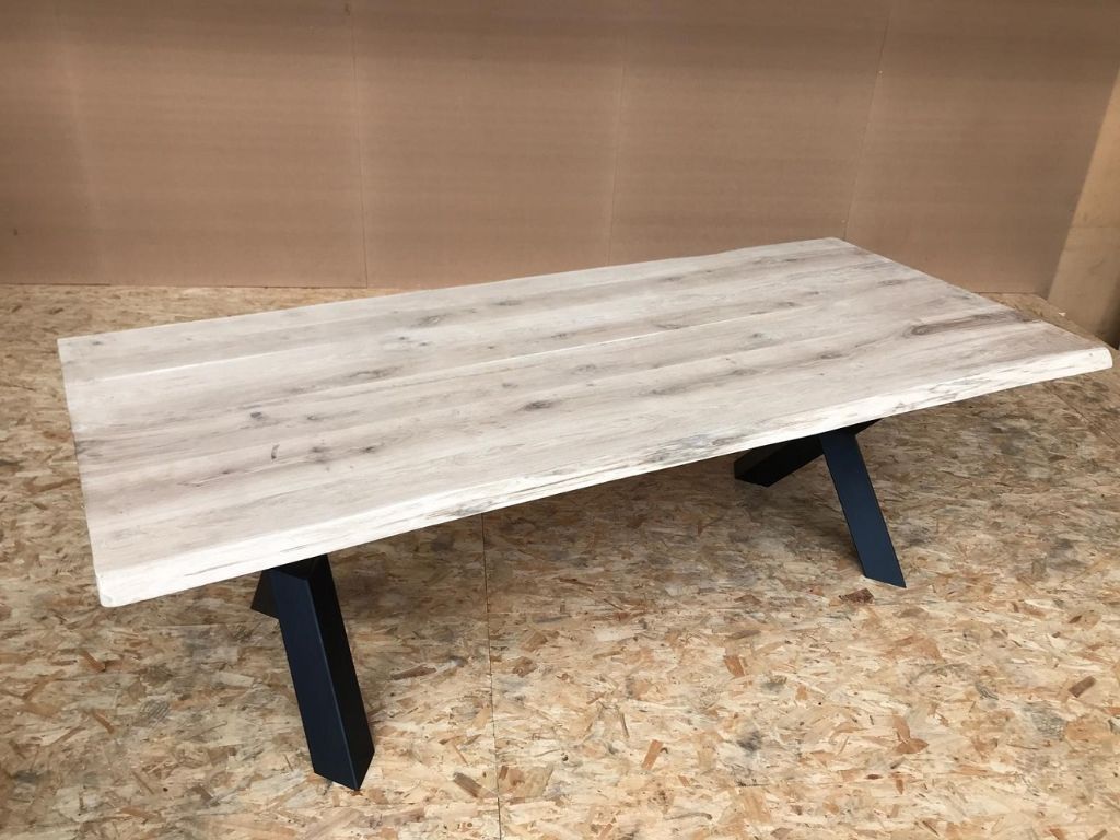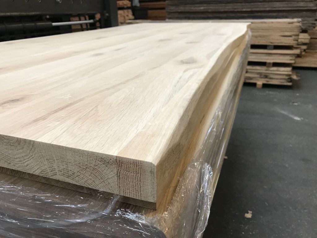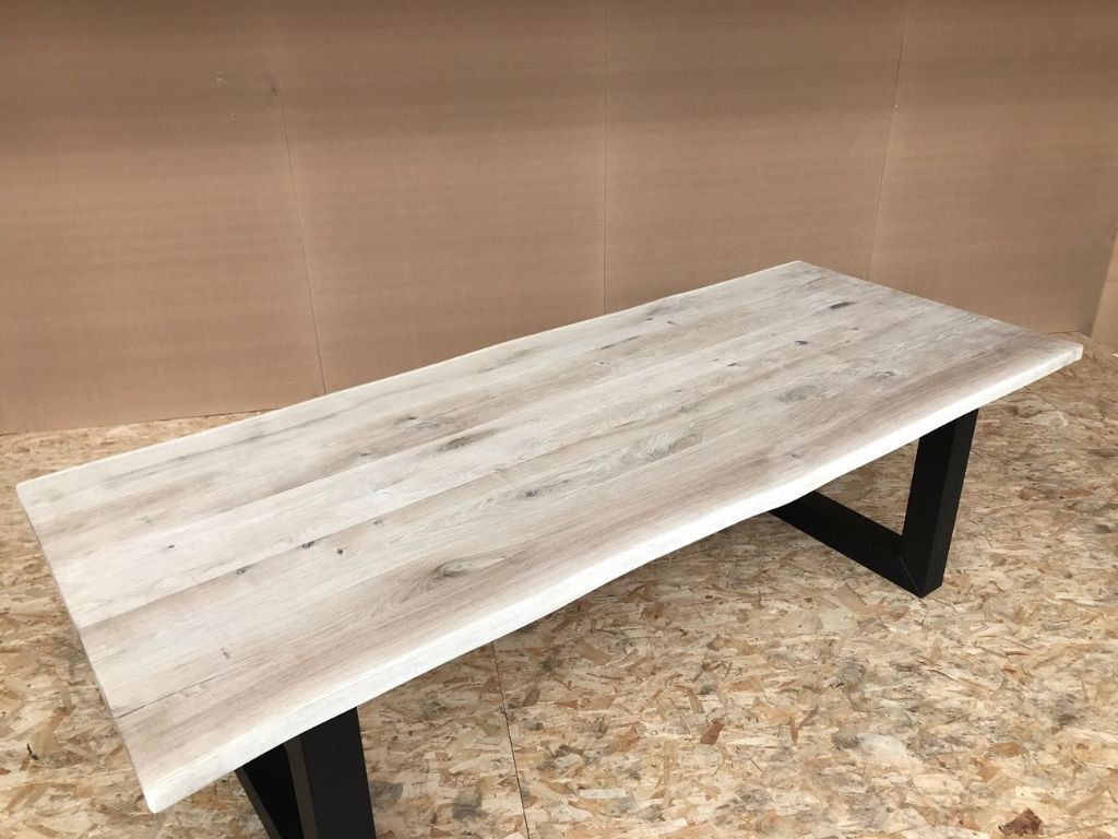 De tafelbladen zijn van topkwaliteit gedroogd Europees Eikenhout en hebben een robuuste uitstraling door de boomschors zijkanten.