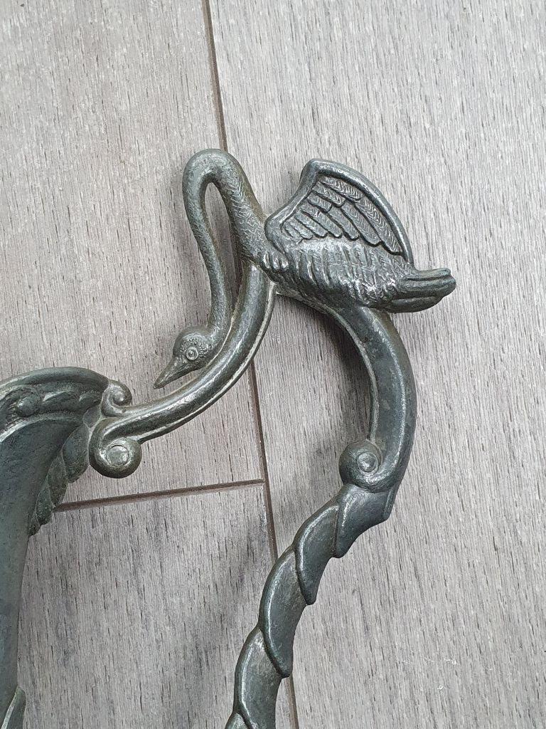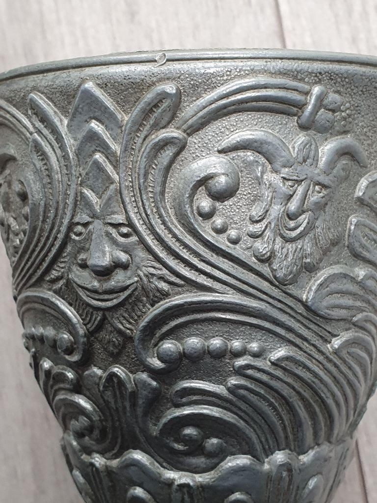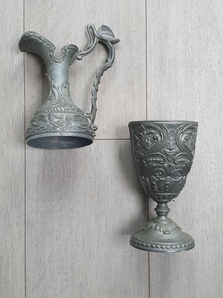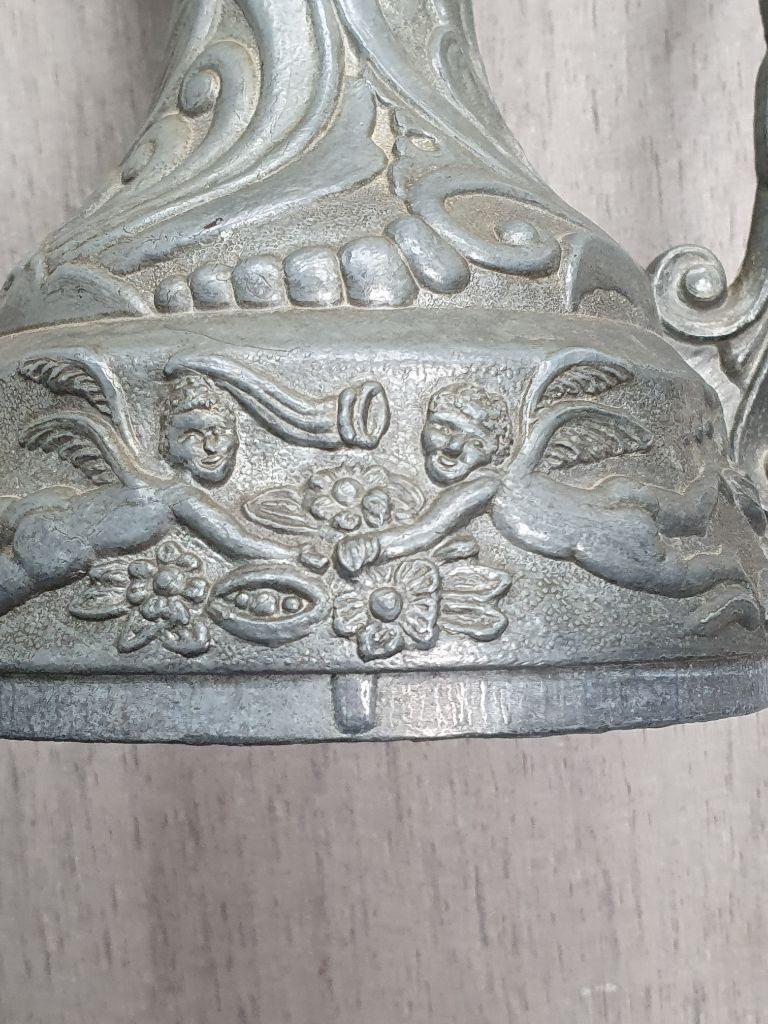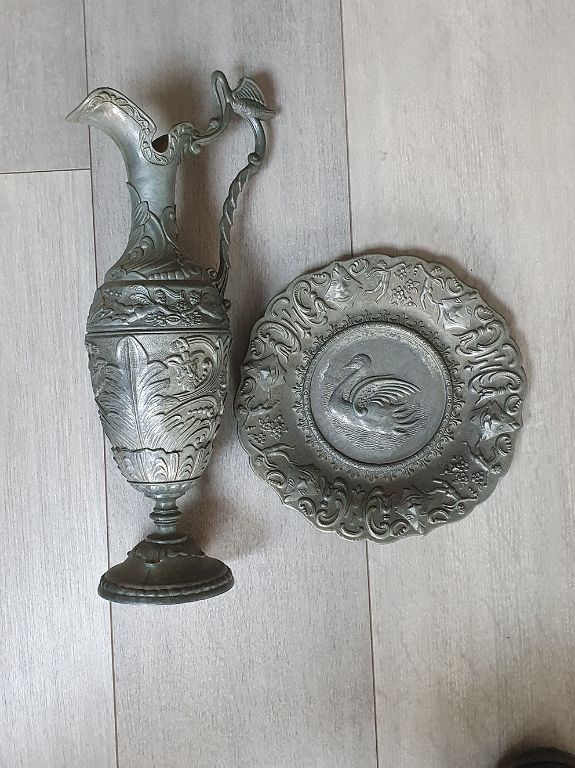 karaf heeft afbeeldingen van cherubijntjes, en geiten, handvat met zwaanmotief.