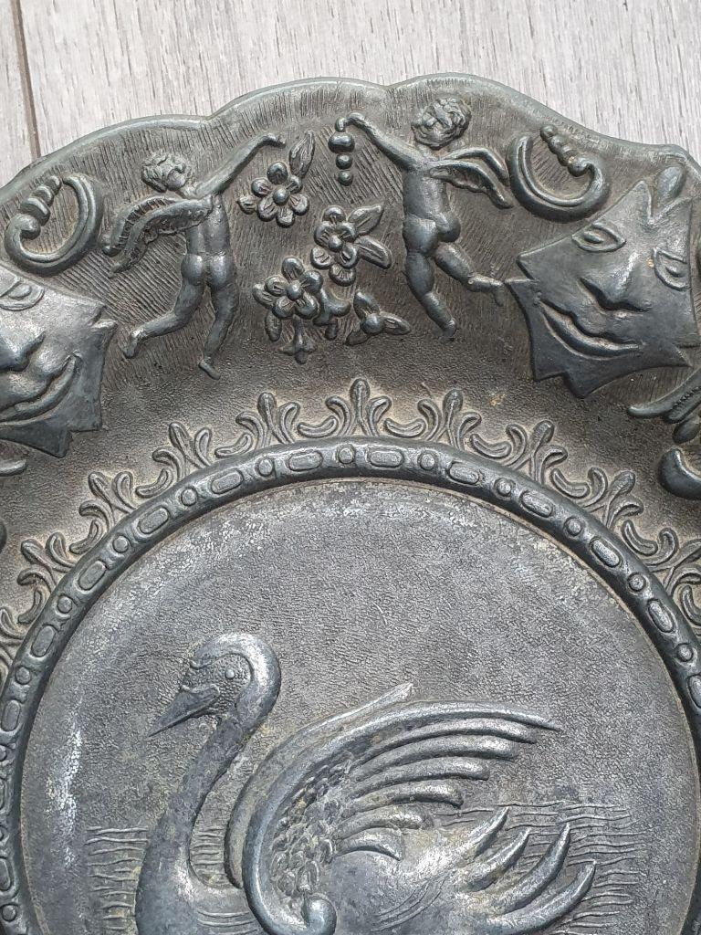 bord binnenzijde zwaanafbeelding, rand met cherubijntjes en gezichten