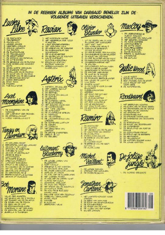 Uitg. Dargaud. 1e druk 1985.  Oorspronkelijk SC, maar nu een HC bibliotheek-exemplaar. Beetje gebruikssporen, maar ziet er toch nog vrij netjes uit. Ondanks dat er plakband is geplaatst tussen het eerste en tweede schutbad, is dit toch losgelaten. Gewicht 363 gram. Verzendkosten vanaf € 3,95. Prijs € 1,95.
