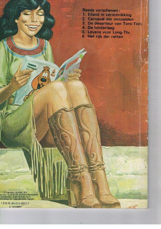Uitg. Dupuis. 2e druk 1979. SC. Wat gebruikssporen o.a. gaatjes in de rug van verwijderde leesmap nietjes, verticale leeskreuken, aan de boven- en/of onderzijde is ca. 2 cm afgesneden, aan de zijkant 1 tot 1,5 cm. Tekeningen en teksten hebben hierdoor geen schade opgelopen. Boekblok is in goede staat. Gewicht 146 gram. Verzendkosten vanaf € 3,95. Prijs € 1,75.