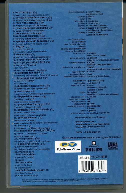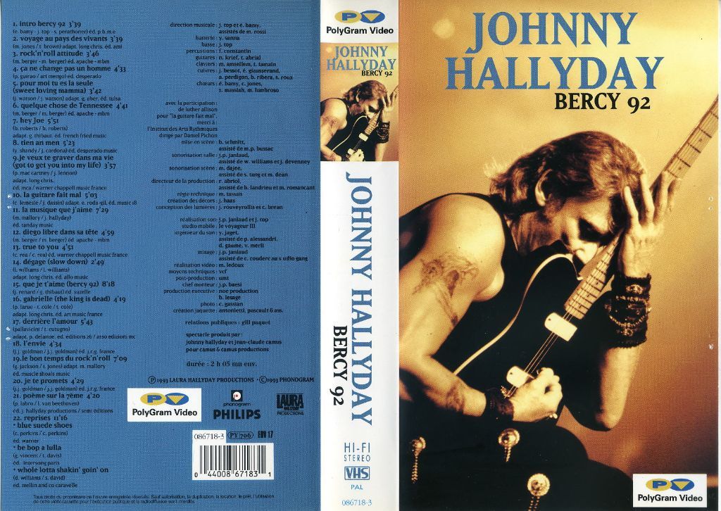 Johnny Hallyday - Bercy 92 live concert (VHS als NIEUW) Ook mooi om op DVD te zetten of te laten zetten. Label VHS : POLYGRAM VIDEO Cataloge: 086718-3 Opname: STEREO Format: VHS BAND PAL Genre: Blues, Pop, Rock enz Tijdsduur: 2:05:00 ...
