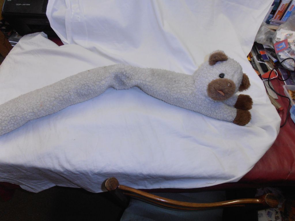 Lengt 81 cm. Wellicht bedoeld voor op de hoedenplank van een auto? Of tegen de tocht bij b.v. een raam? Ik merk, dat de vulling in het midden wat is opgeschoven. Misschien omdat hij een tijdje opgevouwen heeft gezeten? n vrij goede staat. Verzendkosten vanaf € 4,50. Prijs € 7,95.
